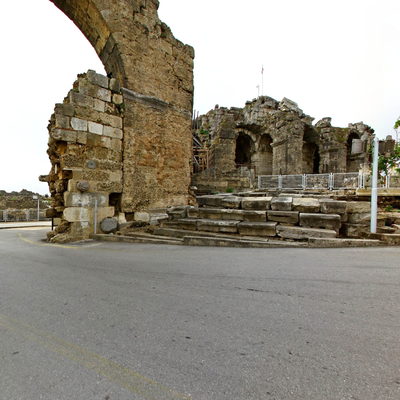 The Theatre lies on the narrowest part of the peninsula and the central side of the Side. Although the theatre plan has a Hellenistic tradition, the building has a Roman architectural tradition in structure. The Theatre of Side is a unique example in this way of structure. Skenae Frons has a three storey colonnade façade. The façade decoration has a characteristic of Antonine Period. In the first storey can be seen the Dionysos Friese. In the frieze, the life of Dionysos, the god of wine and the theatre, describing chronologically from west to the east and the finishing part has Gygantomakhia imagery.