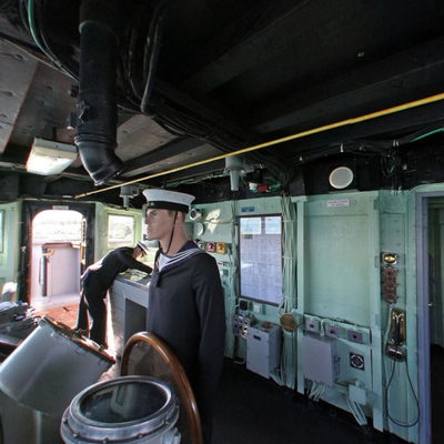 Savaş anında içinde 9 personelin görev aldığı çift namlulu top da karşılamasını yapıyor ve rehber eşliğinde bizler geminin iç bölümlerini gezintiye başladık. Geminin 3 bölümden oluşan er yatakhanesi müze dönüşümü kapsamında görsel sergi alanı yapılmış. Bir bölümde, çeşit çeşit ve bizleri hayran bırakan gemi maketleri, bir bölümde Türk denizcilik tarihinin anlatıldığı panolar, diğer bir bölümde ise denizcilikte kullanılan çeşitli objeler sergileniyor. Atatürk Verteksi ve onursal bölümü haline getirilen subay kamaralarının duvarları Mustafa Kemal’in yazıları ve resimleri ile donatılmış.